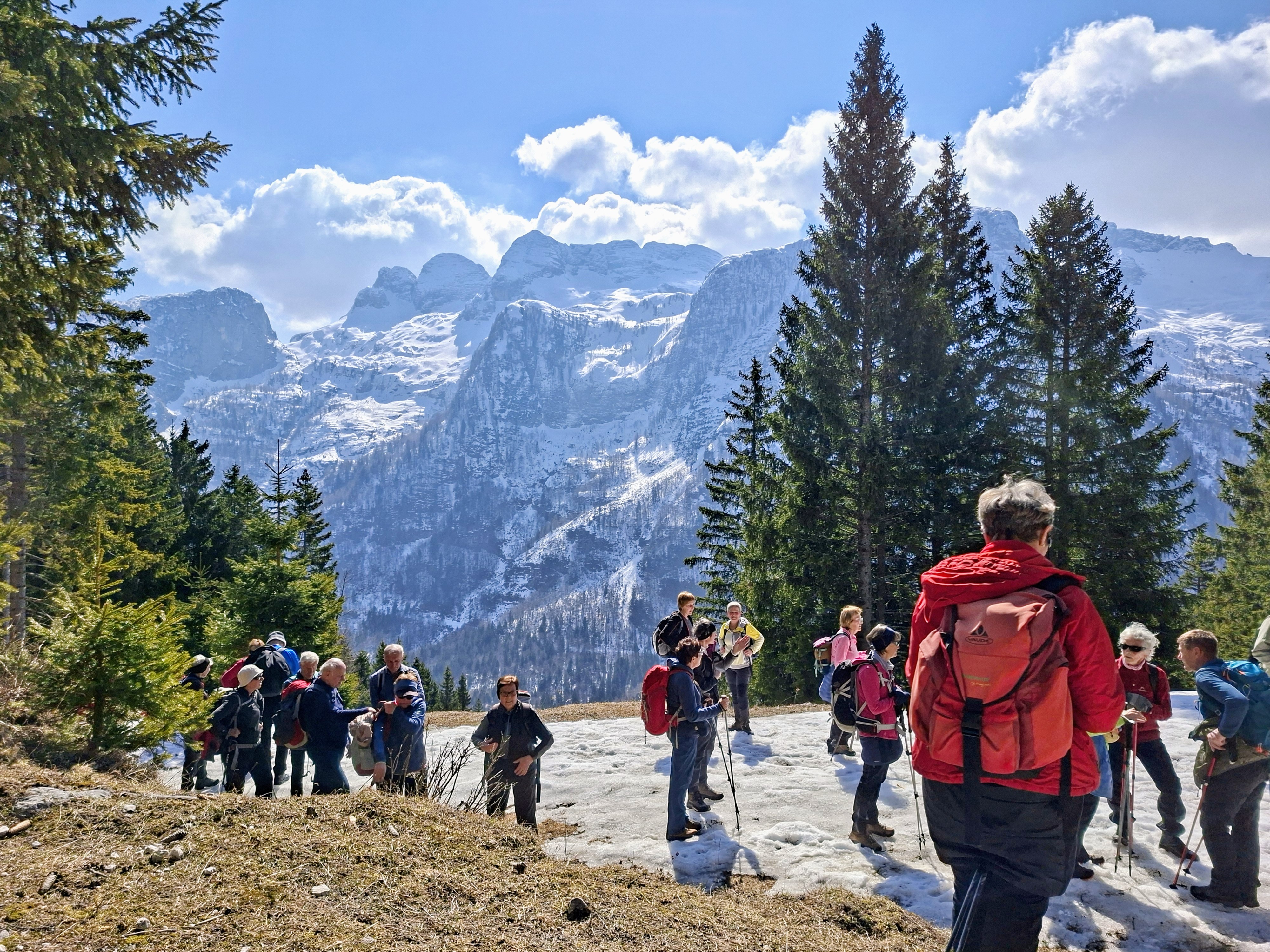 Brigita. Pot nas je vodila mimo Kranjske gore, Rateč, Trbiža in Rabeljskega jezera do smučišča Sella Nevea. Vodnik je bil tokrat Marjan, naš cilj je bila planina Pecol, ki leži pod Montažem. Vreme je bilo prijetno, sončno in je nudilo lepe razgled ob poti, na nasprotni strani doline na Kaninsko pogorje, pred nami pa na Montaž in ostale vrhove.