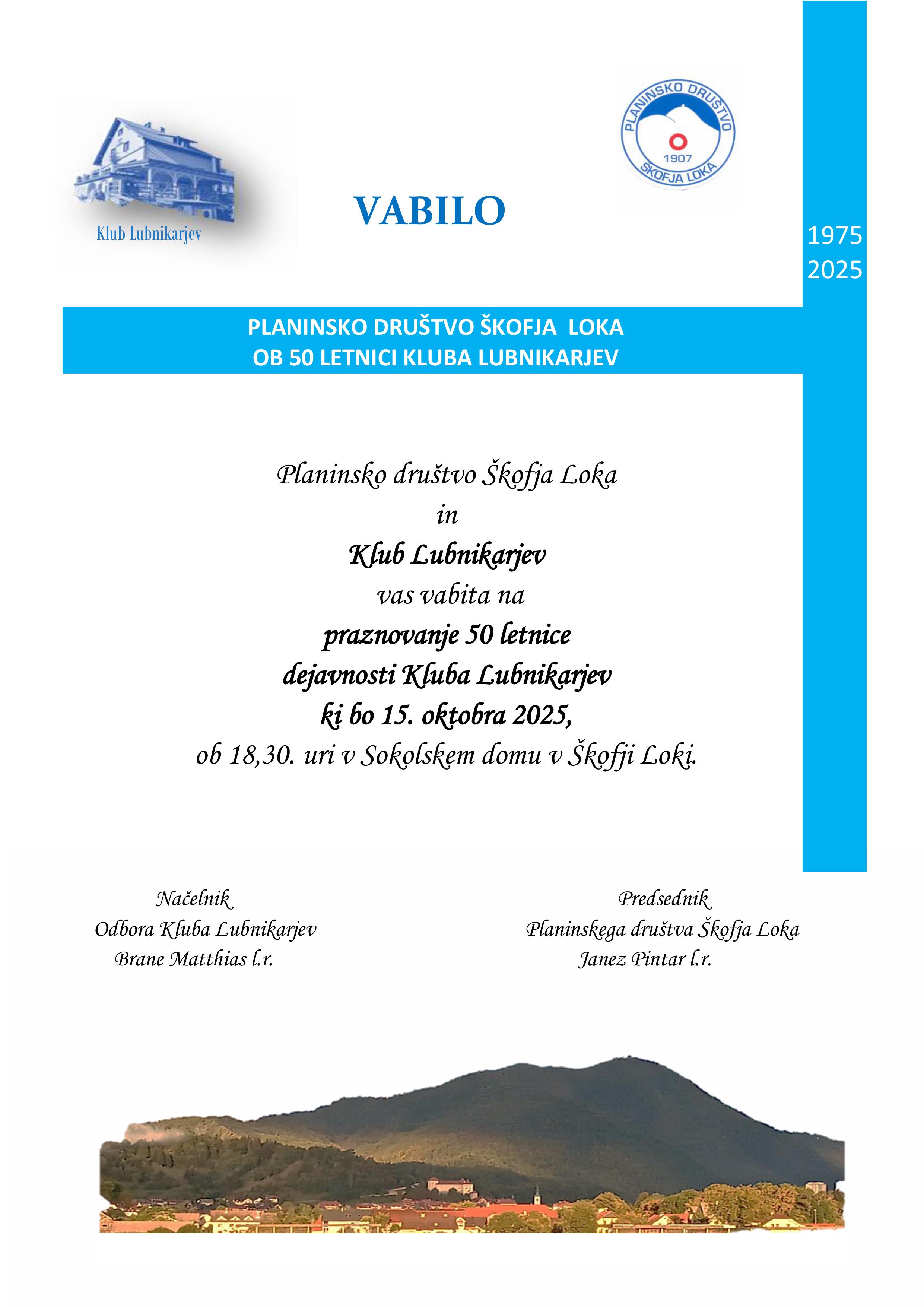 Planinsko društvo Škofja Loka in Klub Lubnikarjev vabita na praznovanje 50 letnice dejavnosti Kluba Lubnikarjev, ki bo v sredo, 15. oktobra 2025 ob 18.30 uri v Sokolskem domu v Škofji Loki.